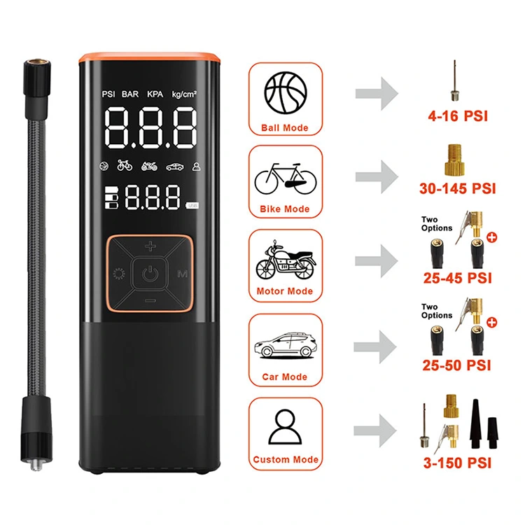 Duze multiple incluse: Vine cu diverse adaptoare pentru anvelope, bile, perne de aer și alte dispozitive gonflabile de până la 150 PSI.